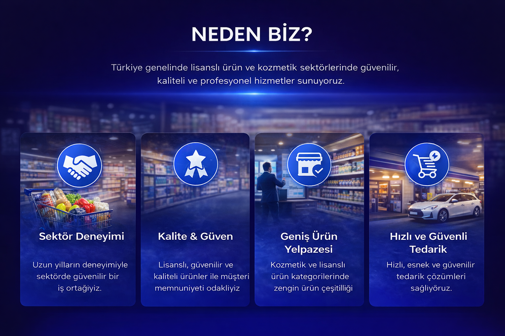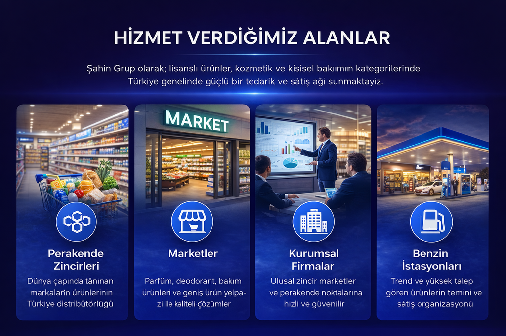 Şahin Grup olarak; lisanslı ürünler, kozmetik ve kişisel bakım kategorilerinde Türkiye genelinde güçlü bir tedarik ve satış ağı sunmaktayız.