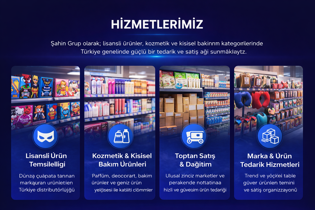 Şahin Grup olarak; lisanslı ürünler, kozmetik ve kişisel bakım kategorilerinde Türkiye genelinde güçlü bir tedarik ve satış ağı sunmaktayız.